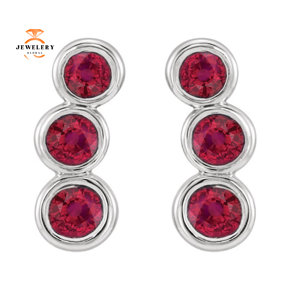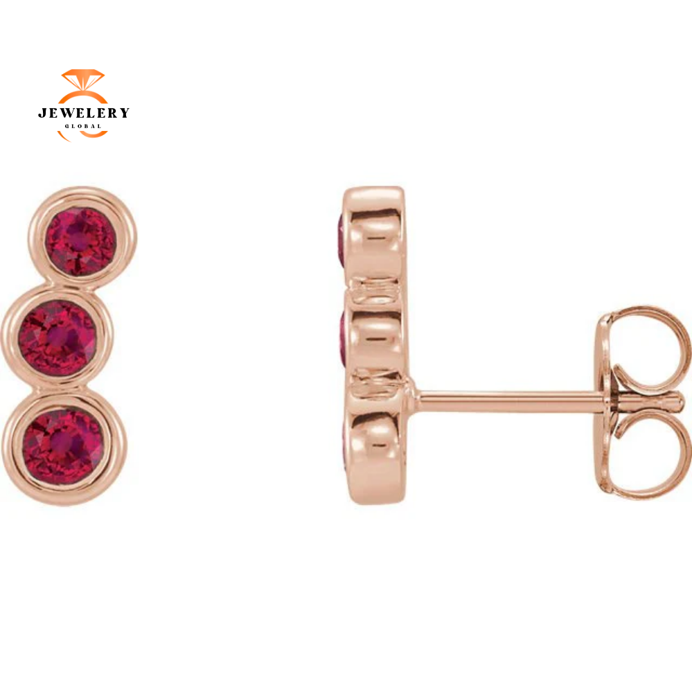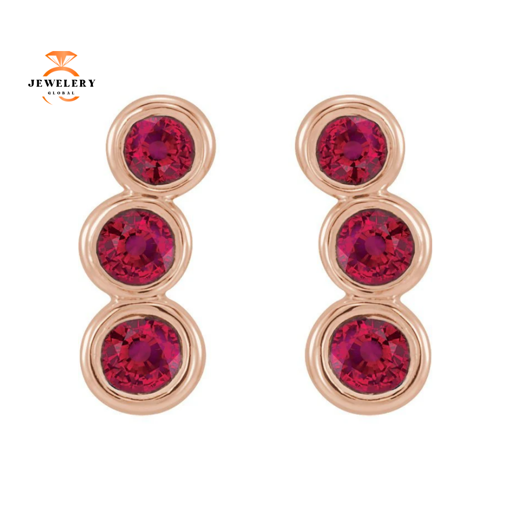 14KT Gold .68 CTW Genuine Round Ruby 3 Stone Ear Climbers.