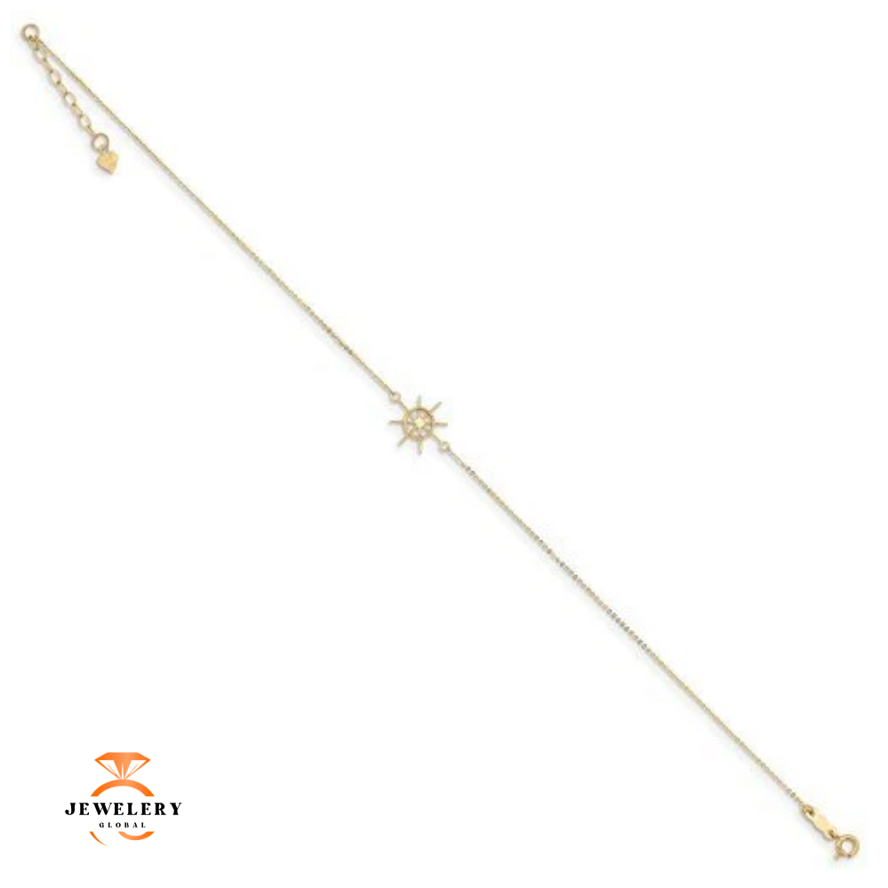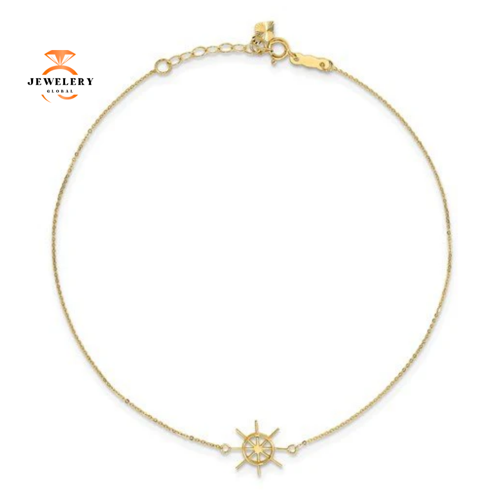 14KT Yellow Gold Polished Captains Wheel Anklet. Adjustable 9-10″ Length With Spring Ring Clasp.