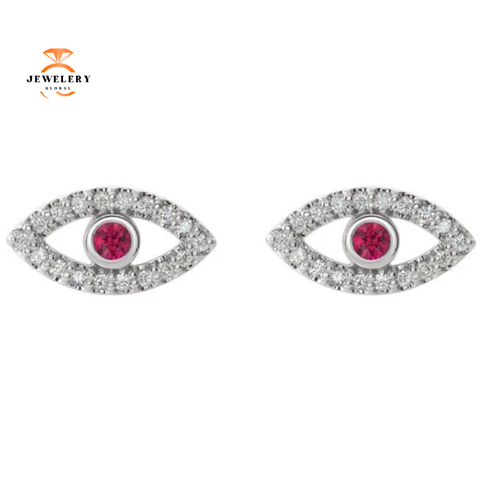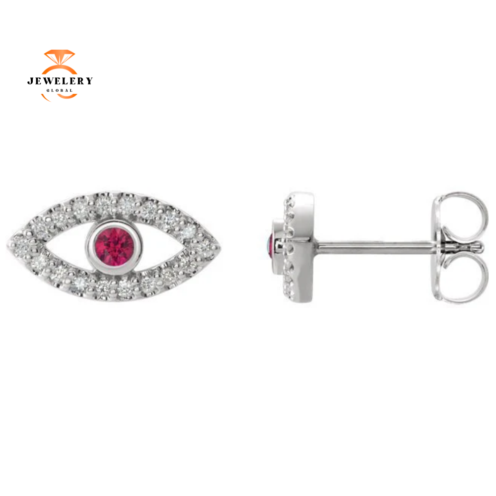 14 Karat Gold Ruby & White Sapphire Evil Eye Stud Earrings. The Earrings Features 2 Round Brilliant Center Rubies that are Accented with Round Brilliant White Sapphires. These Earrings are Available in White, Rose or Yellow Gold.