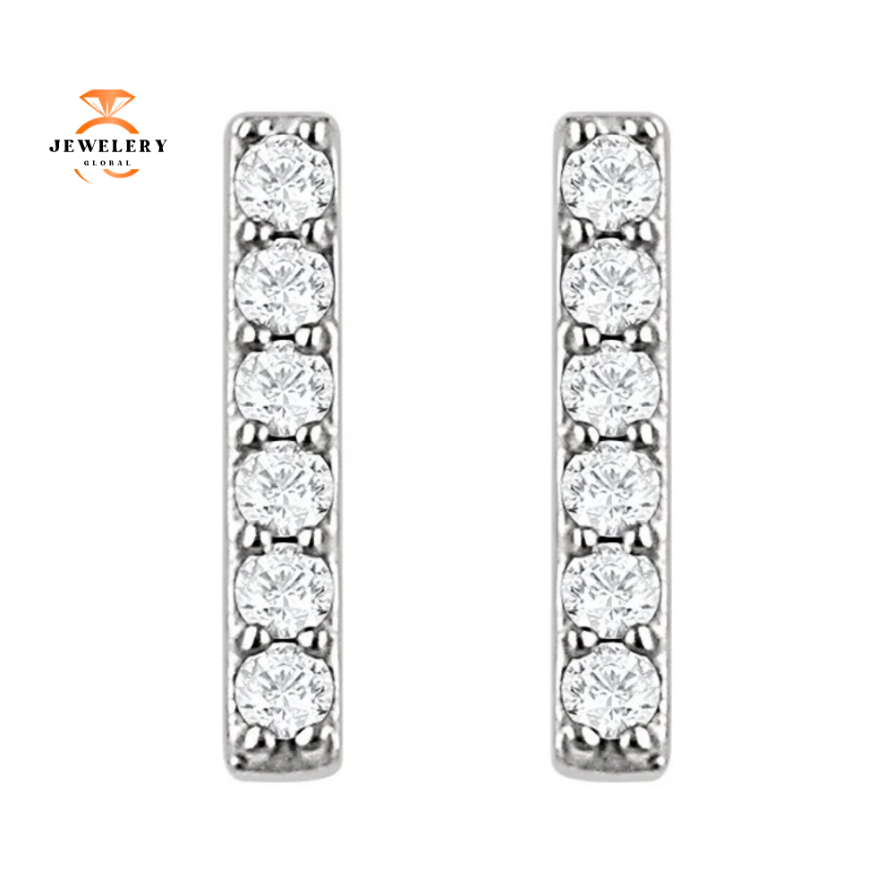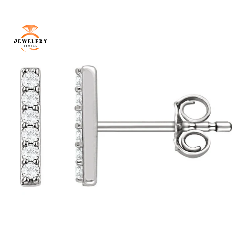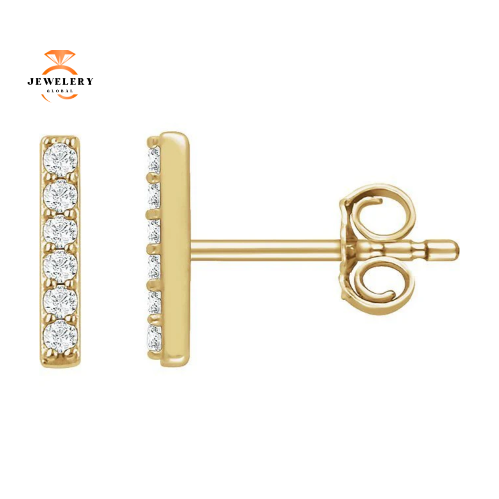 14 Karat Gold 0.10 Carat Total Weight Round Diamond Vertical Bar Earrings. The Diamond Color is H and Clarity is I1.