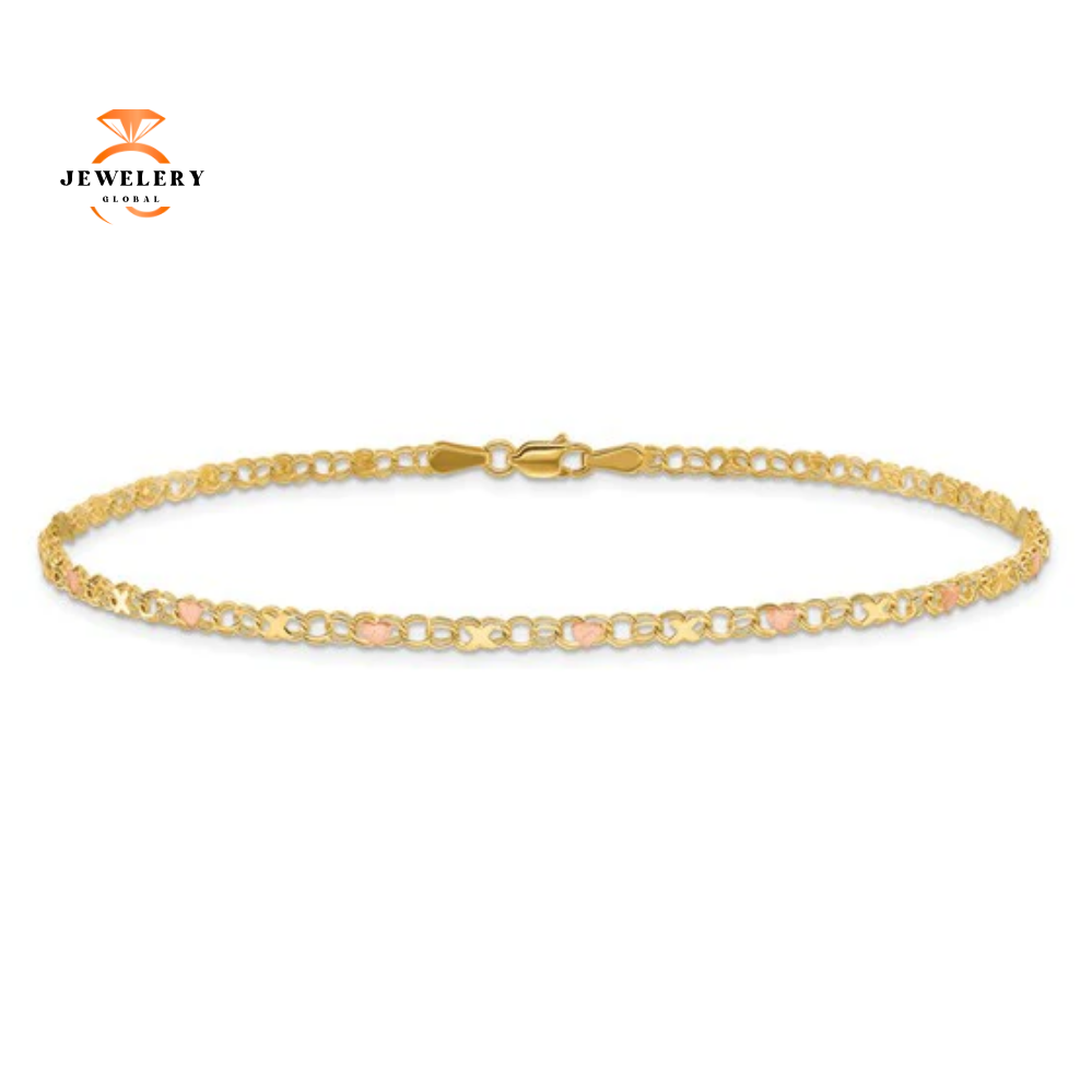 14KT Yellow and Rose Gold X’s and Hearts Anklet. 10″ Length With Lobster Clasp.