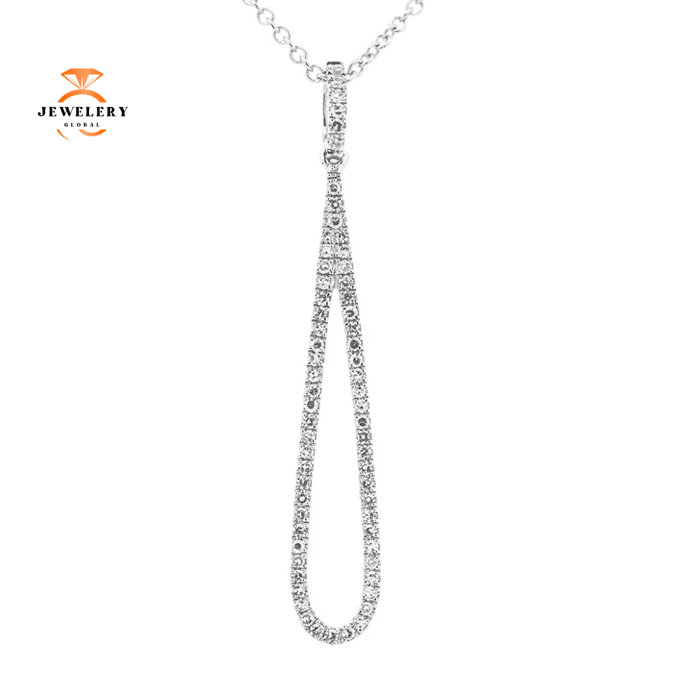 Tear drop 14k white gold pendant with .16 total weight round brilliant diamonds set in the gold. 16″ Chain is included