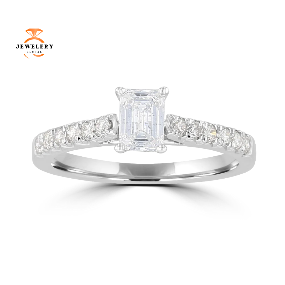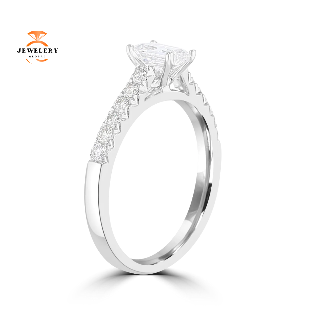 14KT White Gold .50 CT Emerald Cut Diamond and .25 CTW Round Brilliant Diamond Accent Cathedral Ring.