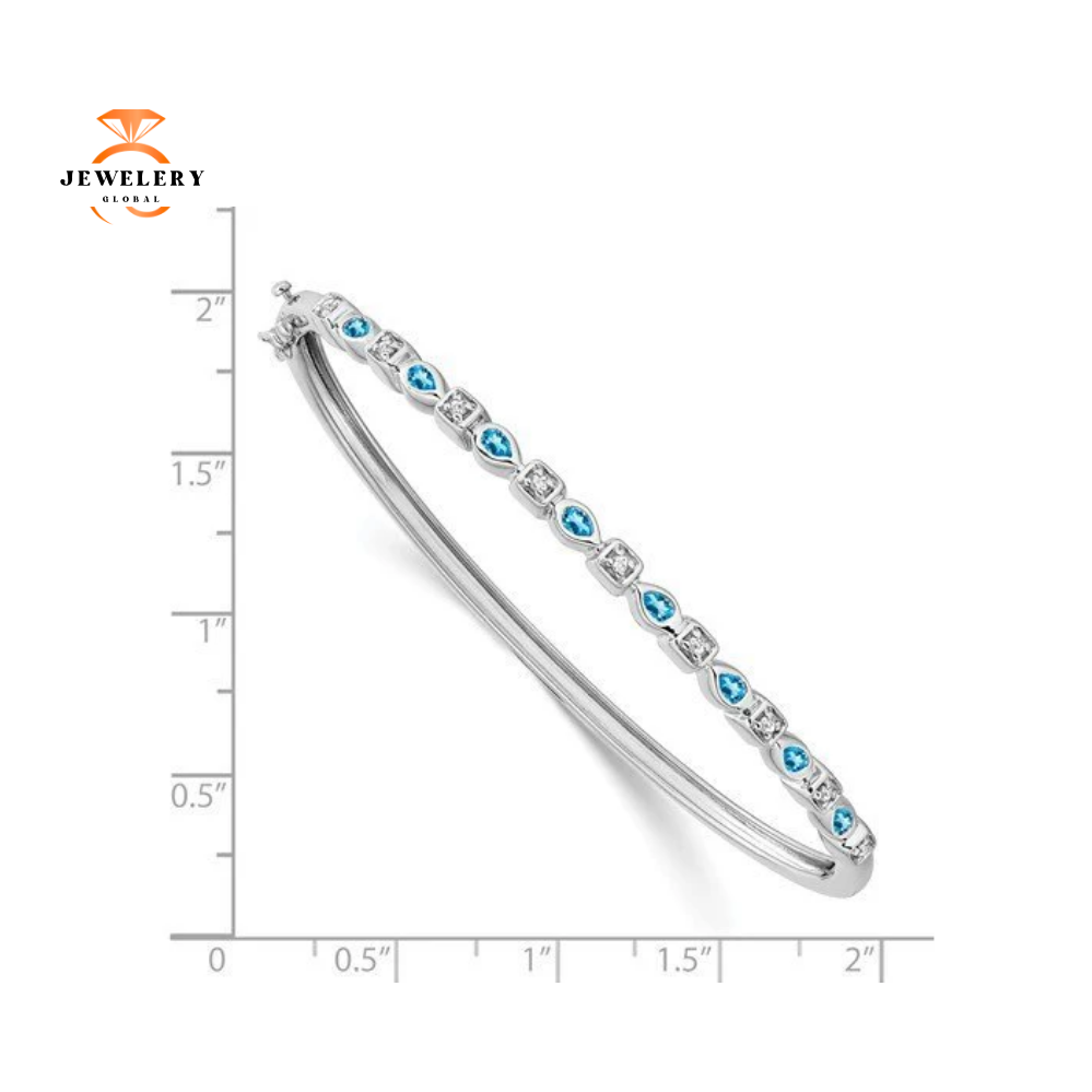 14KT White Gold Blue Topaz And Diamond Bangle. The Bangle Features 0.40 Carat Total Weight of Pear Shape Blue Topaz and 0.108 Carat Total Weight of Round Brilliant Diamonds.