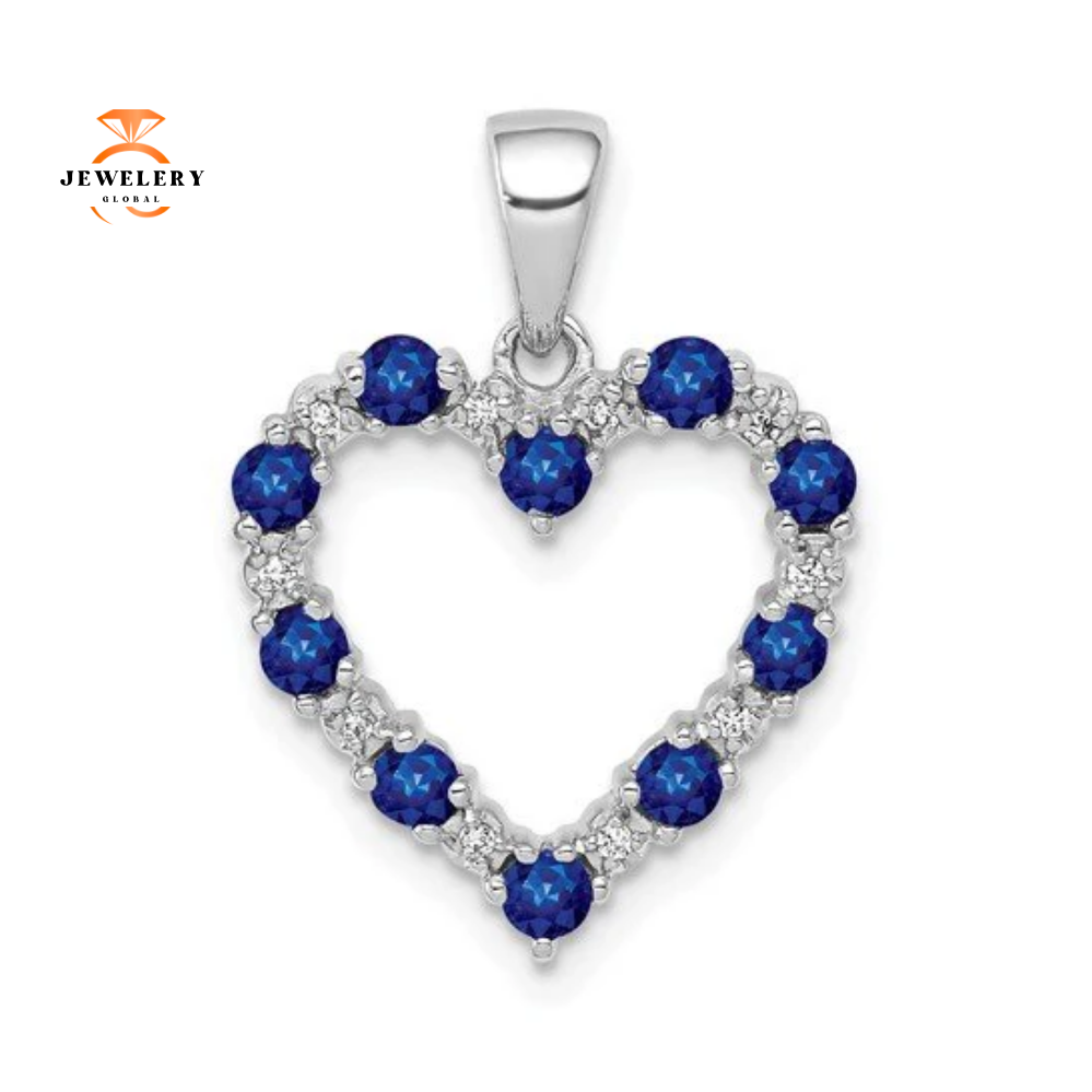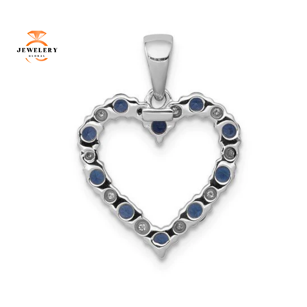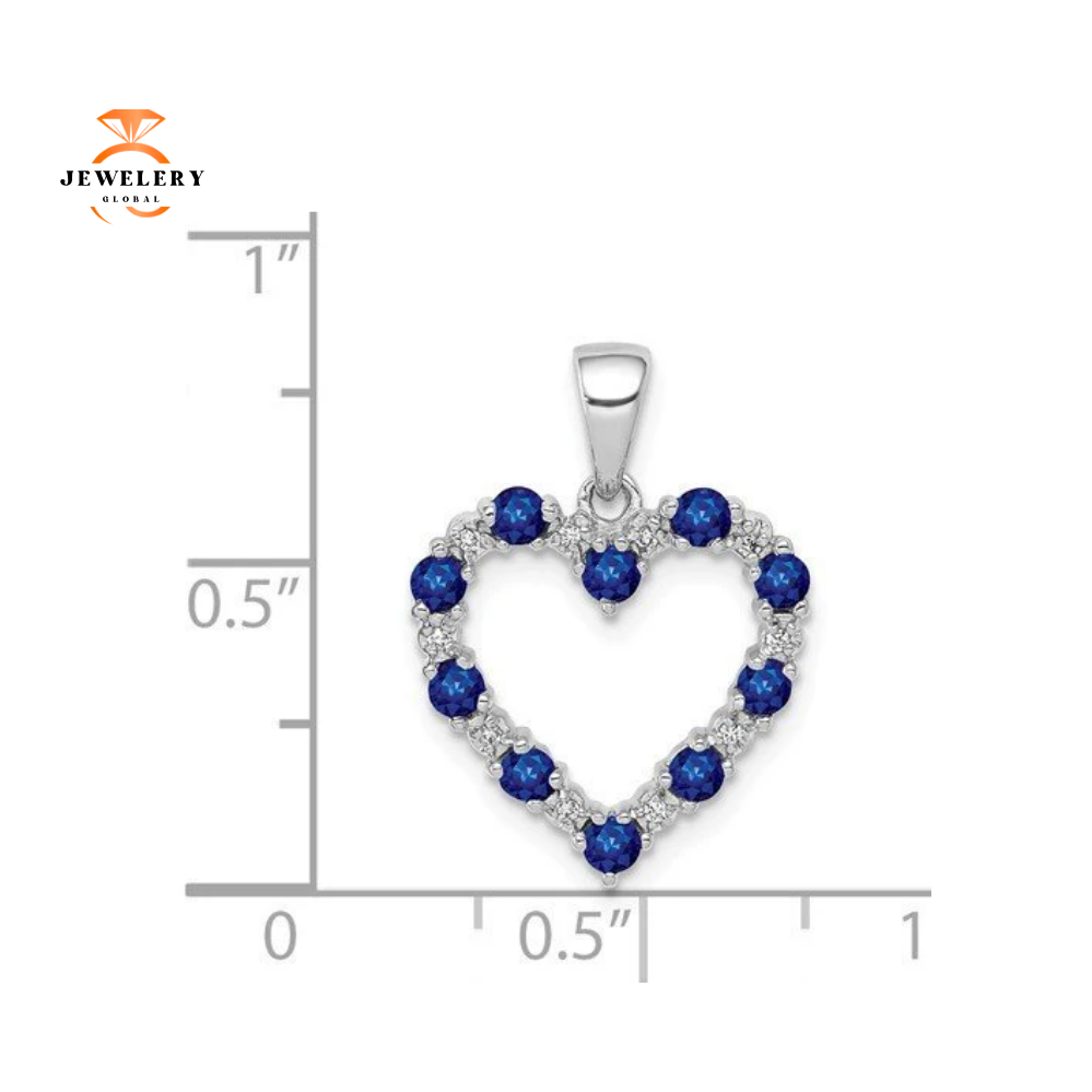 14 Karat White Gold 0.03 CTW Diamond And 0.35 CTW Sapphire Heart Pendant. The Pendant Features 10 Round Brilliant Sapphires that are Accented with 10 smaller Round Brilliant Diamonds.