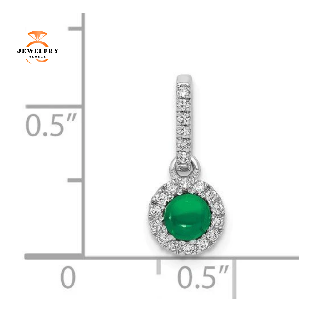 14 Karat White Gold Cabochon Emerald and Diamond Halo Pendant. The Pendant Features a 0.50 Carat Round Cabochon Emerald that Is Accented By 20 Round Brilliant Diamonds that Have A Total Weight of 0.094 Carats.