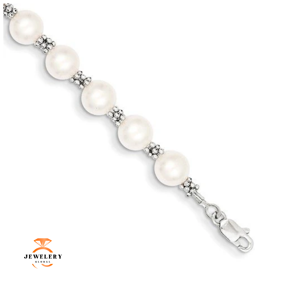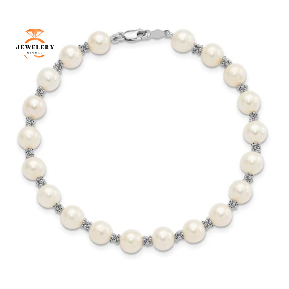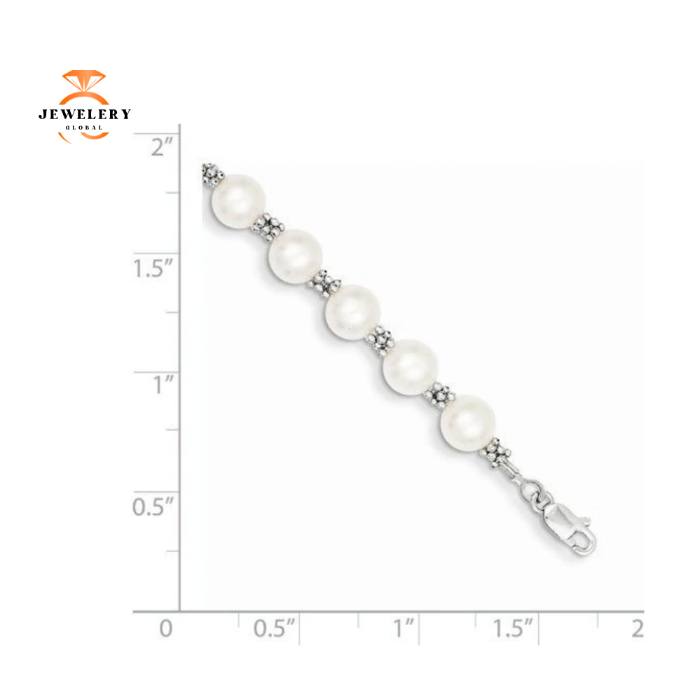 14KT White Gold White Round Freshwater Cultured Pearl Bracelet. The Bracelet Features White Freshwater Cultured Pearls that are 6-7 millimeters in Width that are Set throughout the Milgrain White Gold Beaded Design. The Bracelet is 7.25 Inches in Length.