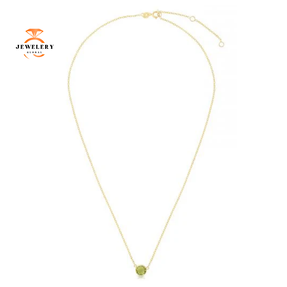 14KT Yellow Gold 0.90 CTW Round Bezel Set Peridot Necklace that is 17 Inches in Length.