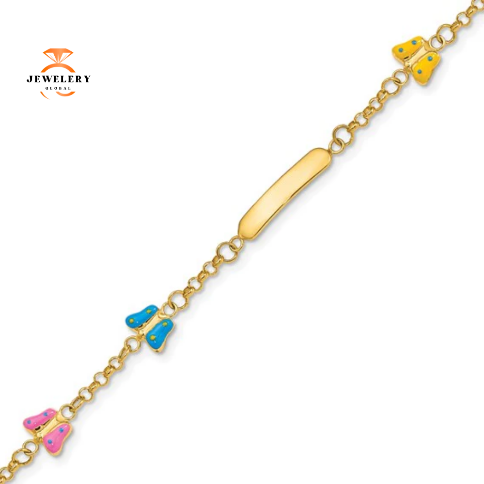 14KT Yellow Gold 6 Inch With 1/2 Inch Extender Enameled Butterfly Child ID Bracelet. The Butterflies Are Enameled to Create The Color.