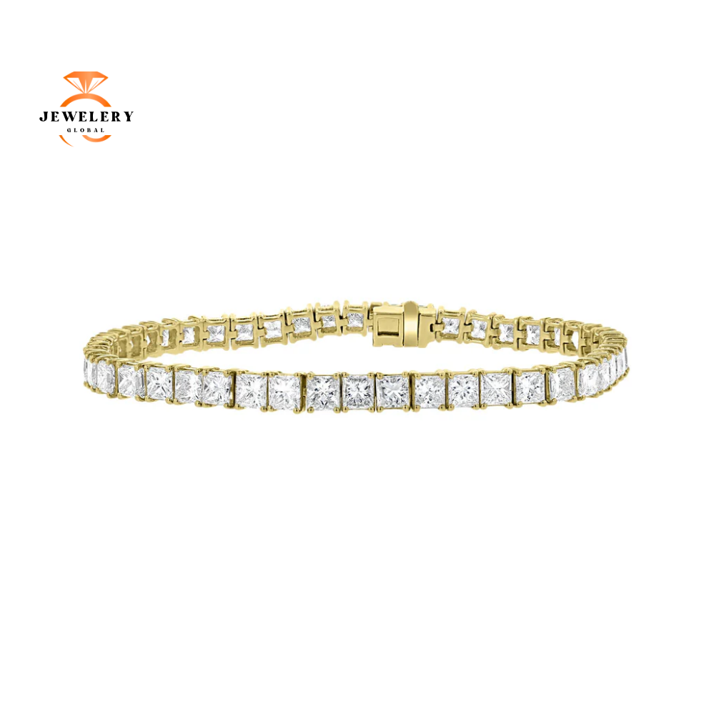 18 Karat Yellow Gold 13.12 Carat Total Weight Princess Cut Diamond 4 Prong Tennis Bracelet.
