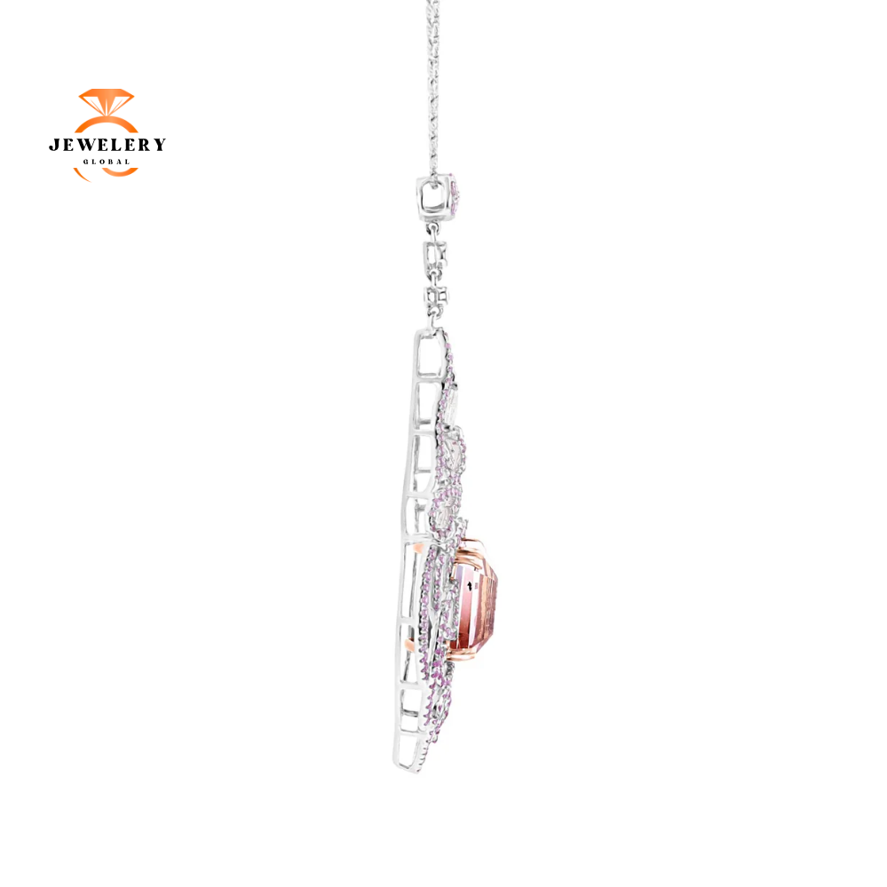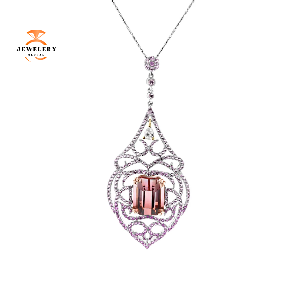 Juleve 18KT White Gold 19.82 CT Emerald Cut Bi-Color Tourmaline, 5.31 CTW Round Pink Sapphires and .32 CT Pear Cut Diamond Teardrop Slide Pendant. Necklace Not Included.
