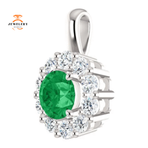 14KT WHITE GOLD ROUND EMERALD AND DIAMOND HALO PENDANT