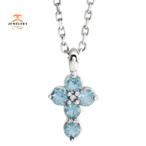 14KT GOLD AQUAMARINE PETITE CROSS PENDANT 16-18″ NECKLACE